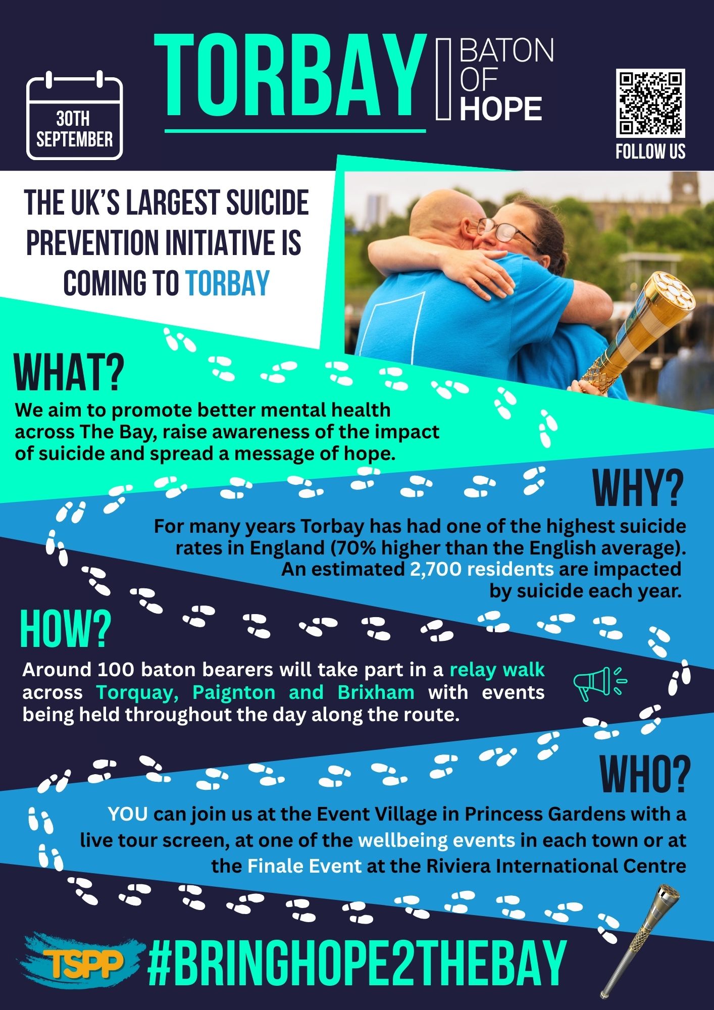 We’re proud to announce that Torbay has been chosen as the only South West stop for the Baton of Hope tour – a powerful national event raising awareness around suicide prevention and celebrating mental wellbeing.