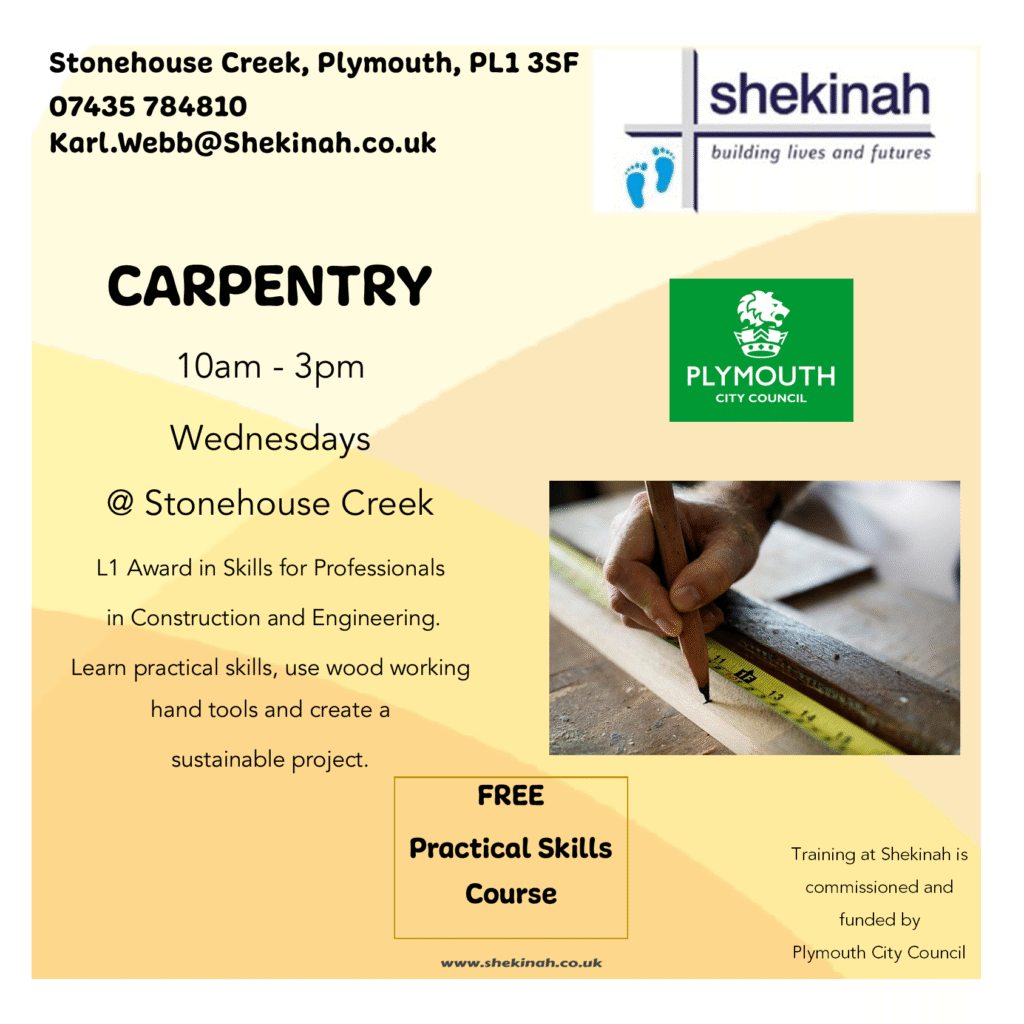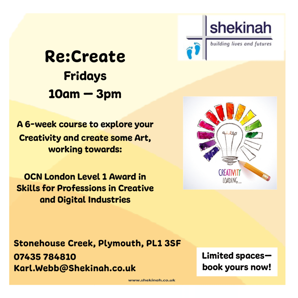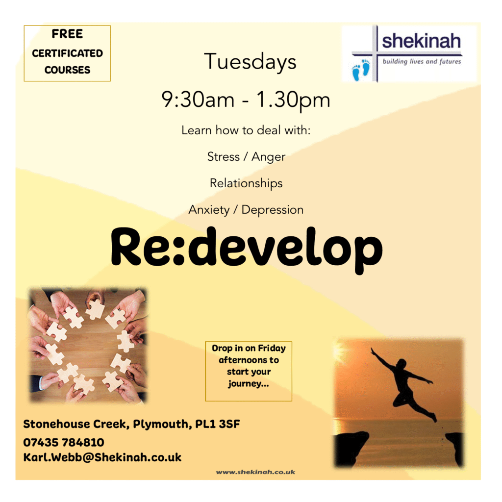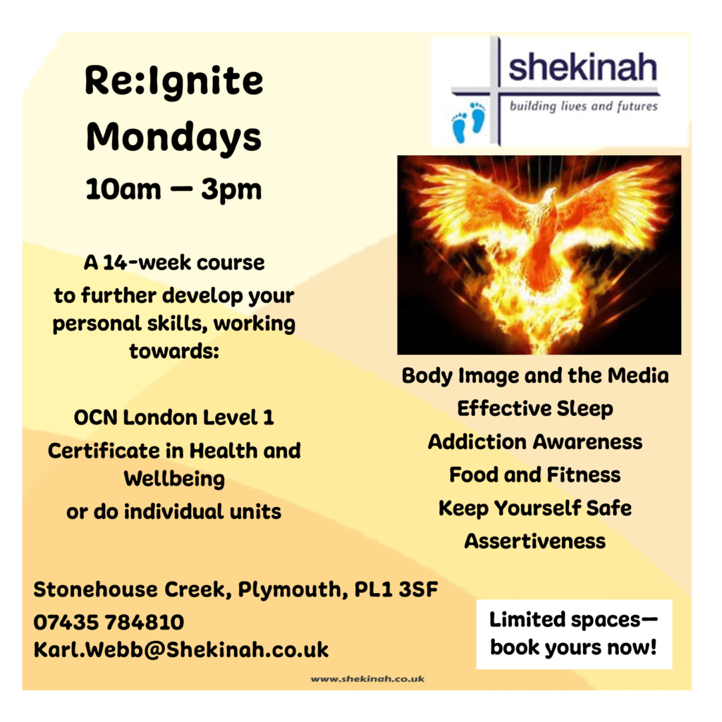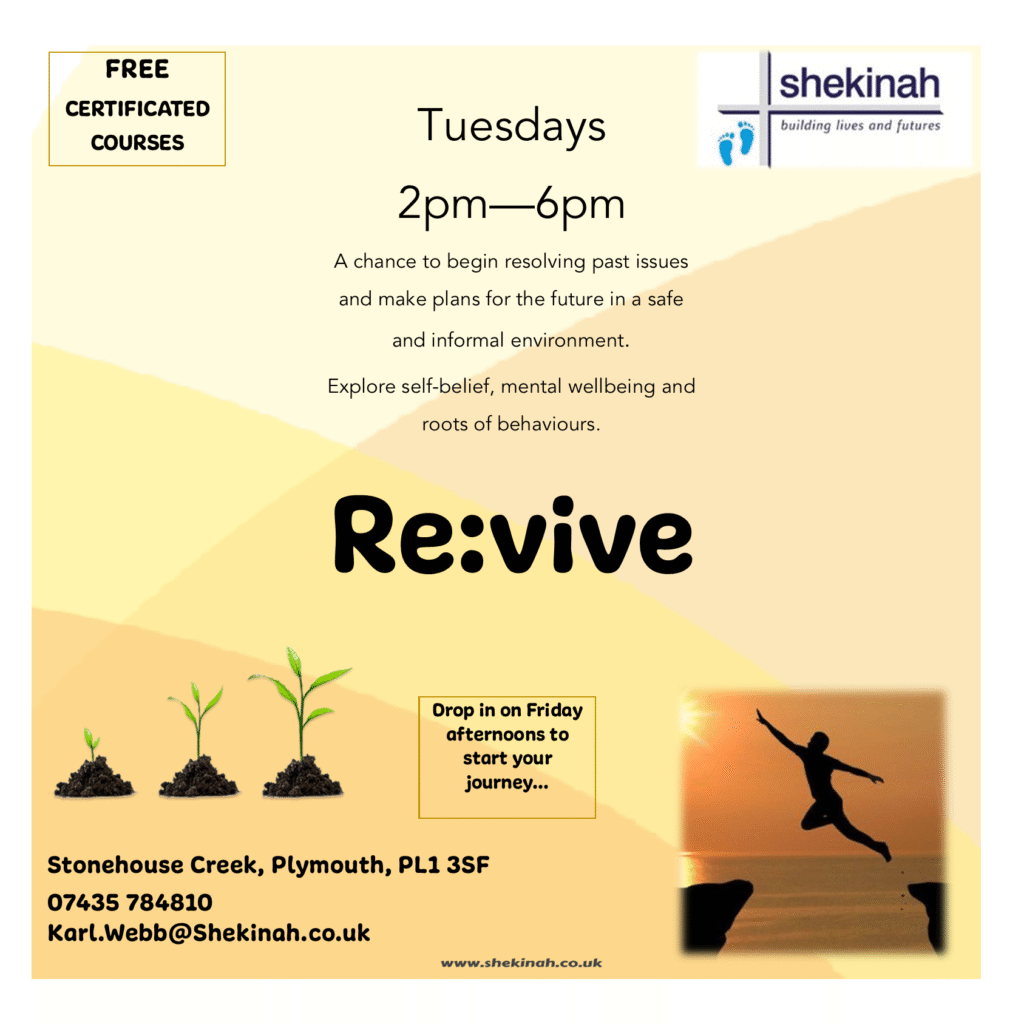 Shekinah’s training centre in Plymouth offers a range of flexible and personalised programmes, which are designed to help people to move forward at their own pace, from wherever they are. “If we can’t help, we know someone who can” through our links to partnership organisations such as The Alliance, Shelter, Make Amends, Probation, Soup Run and 12 Step Fellowships.